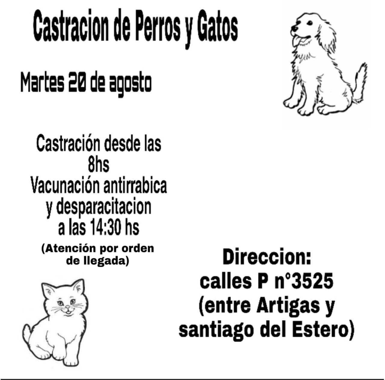 Nota de la redacción: Castración, vacunación antirrábica y desparasitación. Dirección: Calle P N° 3525 (entre Artigas y Santiago del Estero).