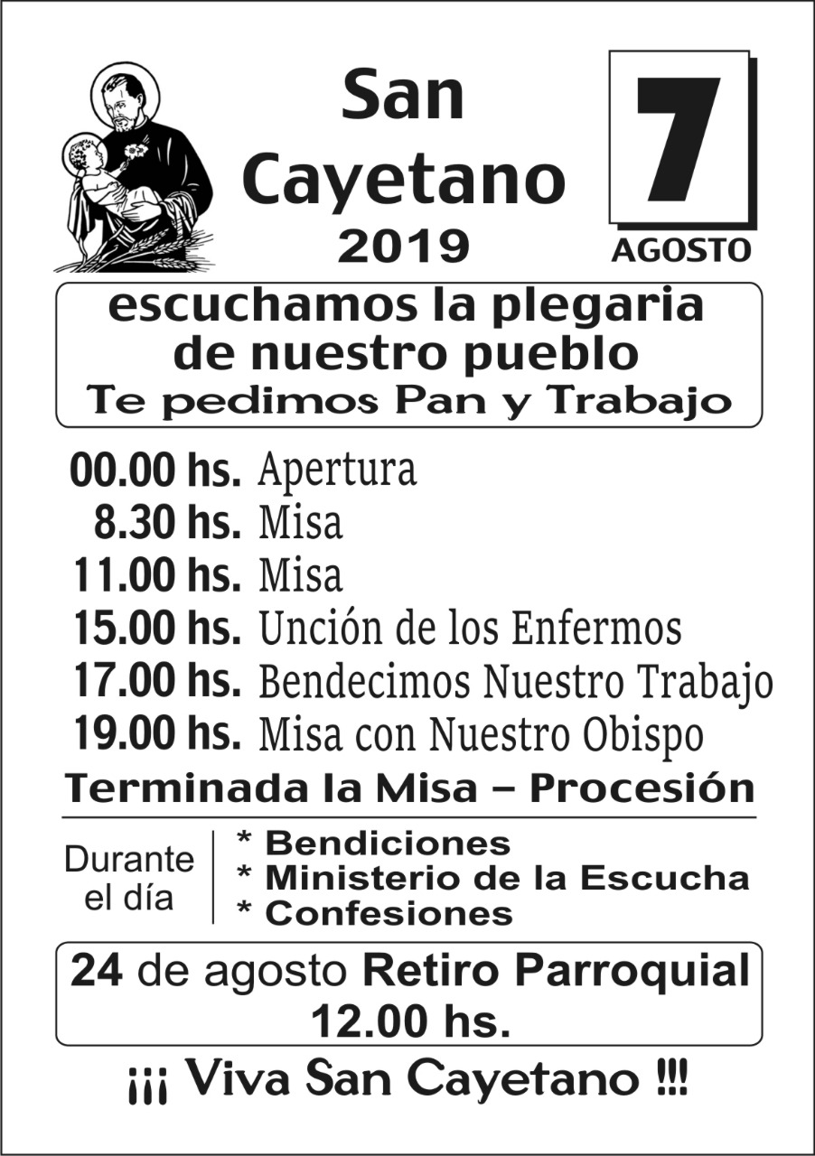 La última Misa se celebrará a las 21 horas. La parroquia San Cayetano de Villa Hidalgo se encuentra en San Cayetano y Manuel Estrada. Desde la estación de tren de José León Suárez llega la línea de colectivos 127, cartel rojo. (El almuerzo del retiro parroquial del 24 de agosto será "a la canasta".